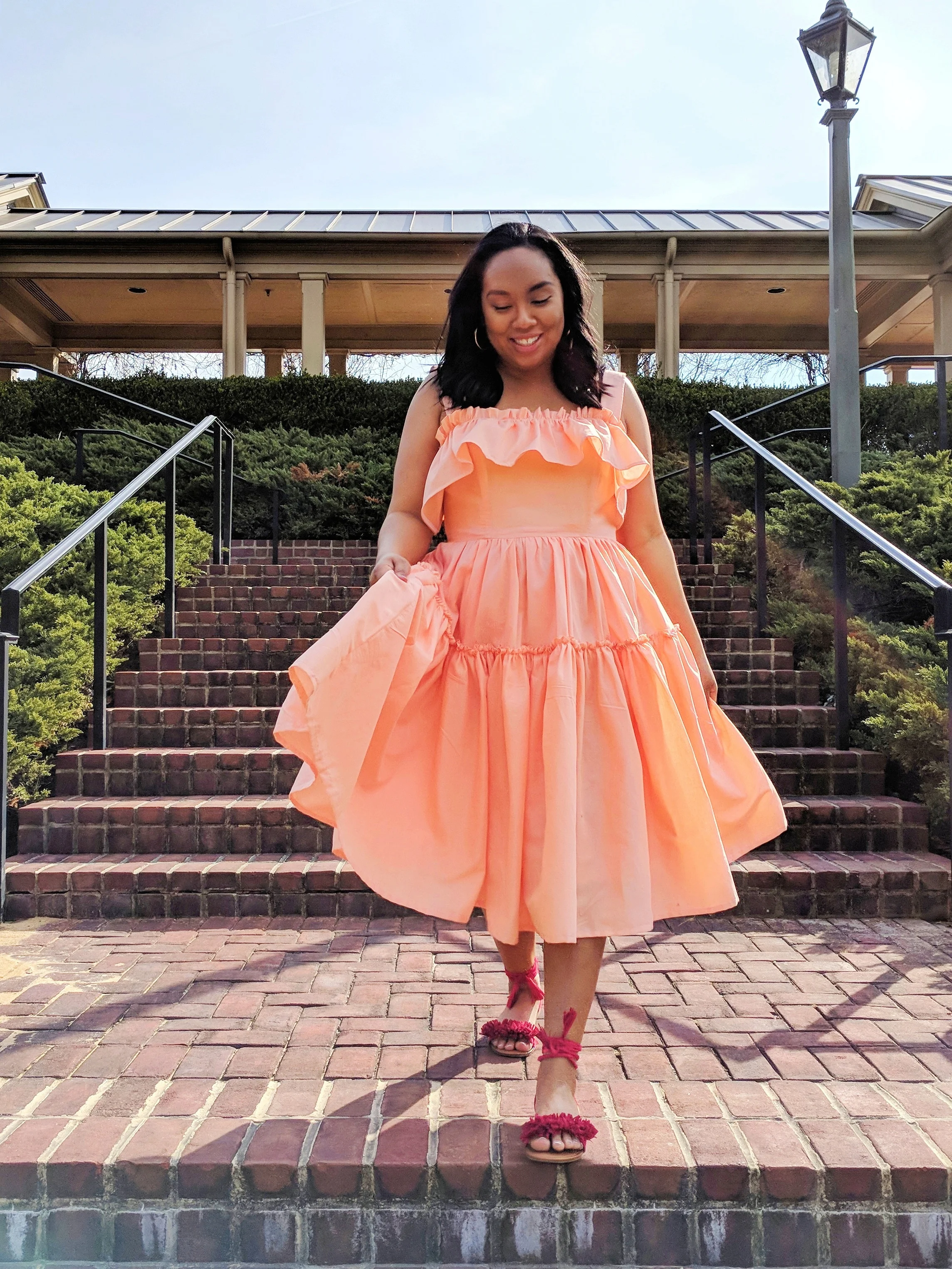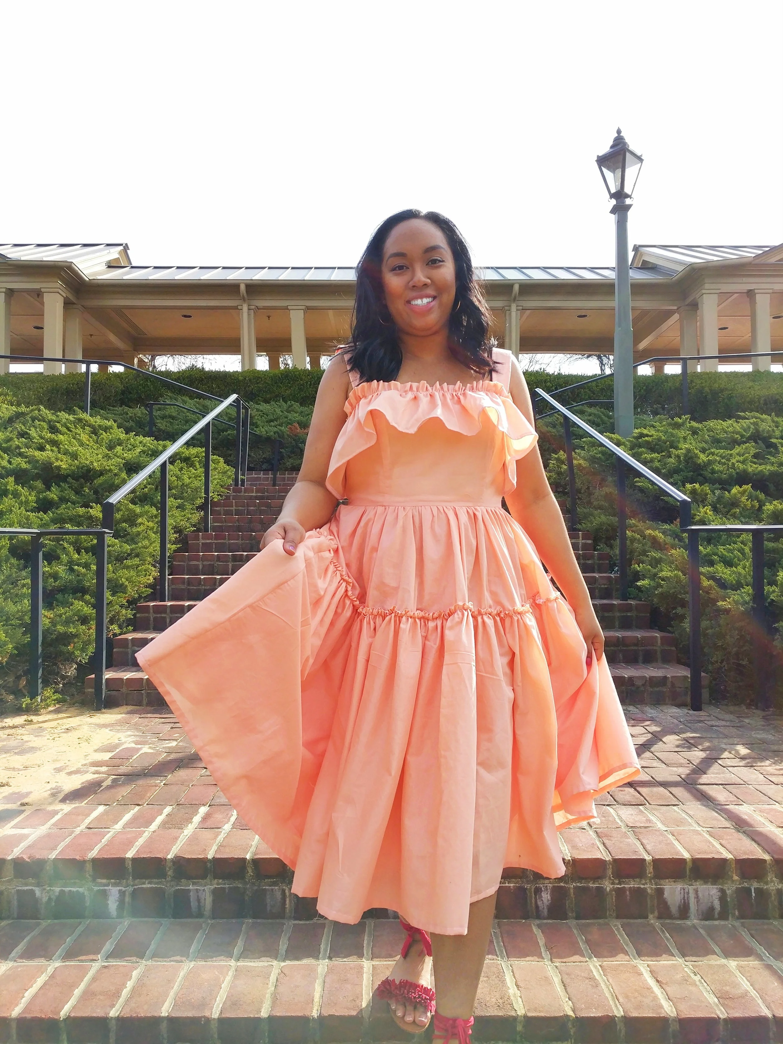 So while scrolling through the Gram, I came across this dress on on of my favorite fashion bloggers and added it to my To-Make list. This dress was designed by Cynthia Rowley and retails for $325. I don't know about you, but I don't have $325 to spend on a casual everyday dress. So, I decided to make one in the color of my choosing 🍑 for approximately $20.