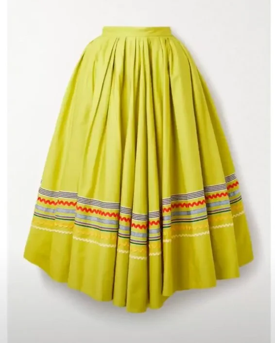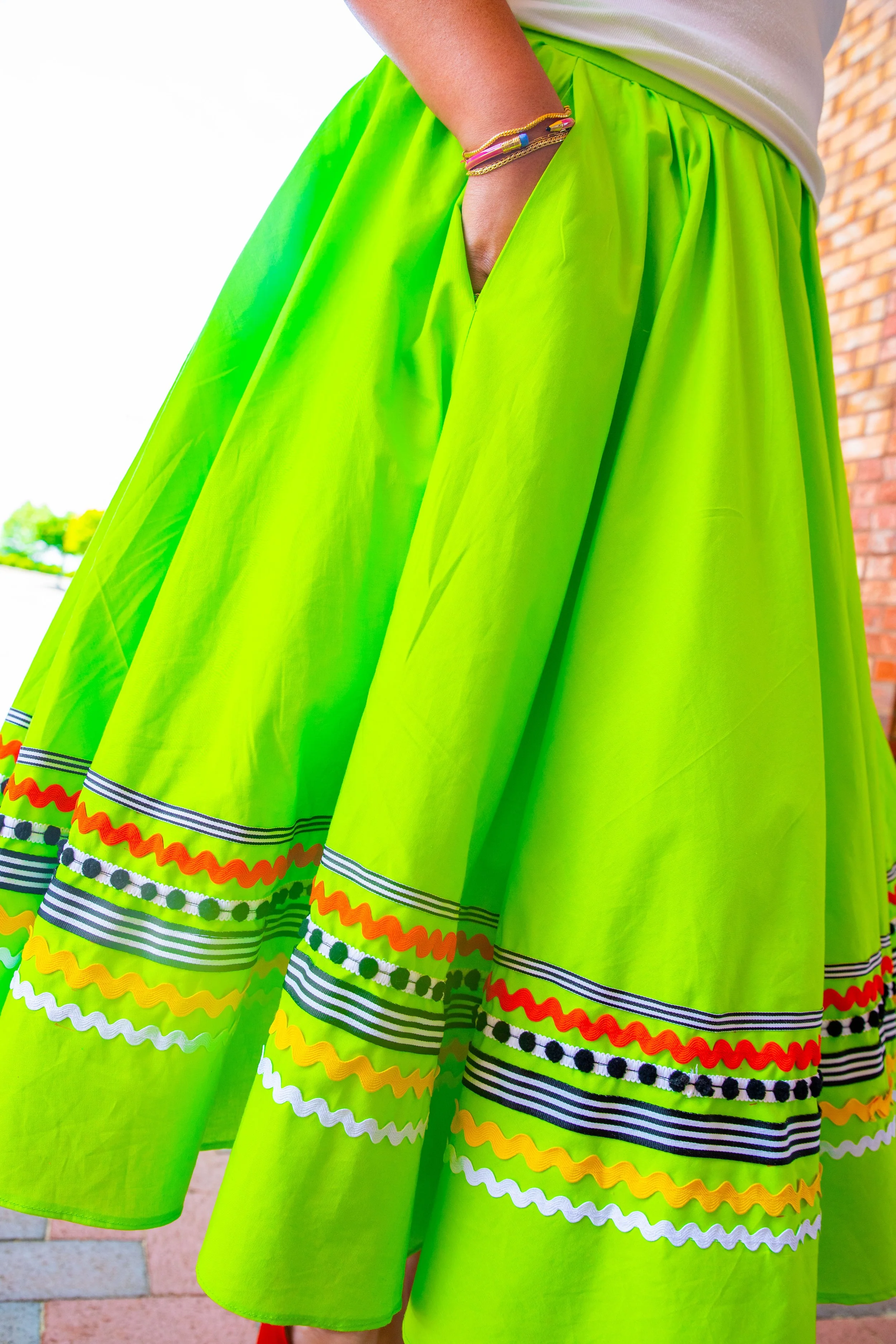 See…the thing about knowing to sew really well is that you can look at any garment and figure out how to make some sort of version of it. I already knew this skirt was on my list to make as soon as I saw because just from the looks of it, it’s not difficult at all. However…it is a tedious project. Give yourself a couple of days because the trim was a lot to sew. To me, it was well worth it because besides the bold neon green, the trim textures and colors were on point.